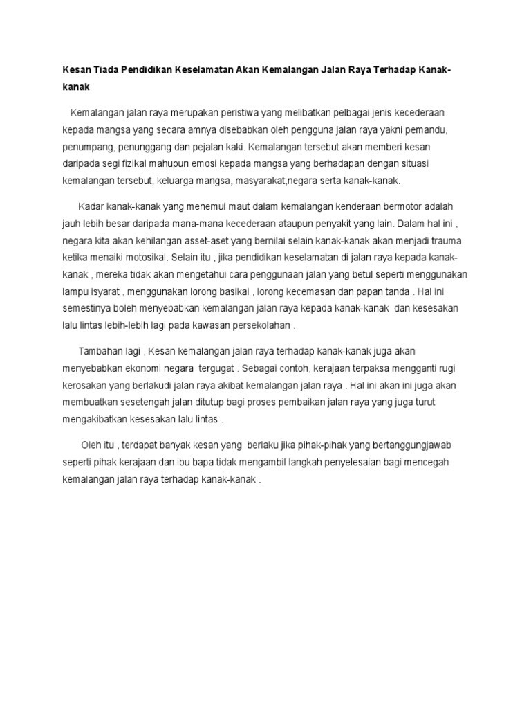 Kesan Tiada Pendidikan Keselamatan Akan Kemalangan Jalan Raya Terhadap Kanak Pdf
