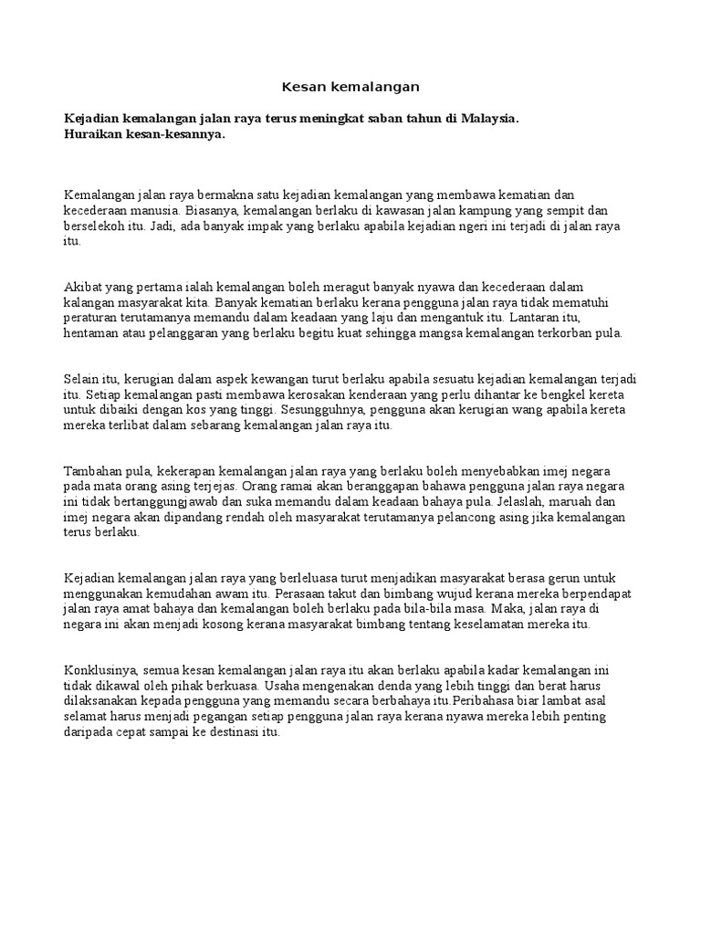 Kesan Kemalangan Amir Syafiq Docx Karangan 1 Pt3 Kesan Kemalangan Jalan Raya Di Malaysia Akibat Kemalangan Boleh Meragut Banyak Nyawa Dan Kecederaan Course Hero